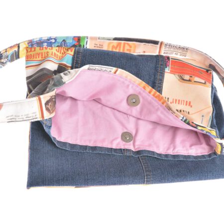 Ежедневна чанта изработена от дънков материал и весел плат с десен на ретро автомобили. Чантата е в модерния стил „торба“, но същевременно има подплата, един вътрешен джоб и два външни. Закопчава се с вътрешно и външно копче. Дълга дръжка за по-удобно носене през рамо.