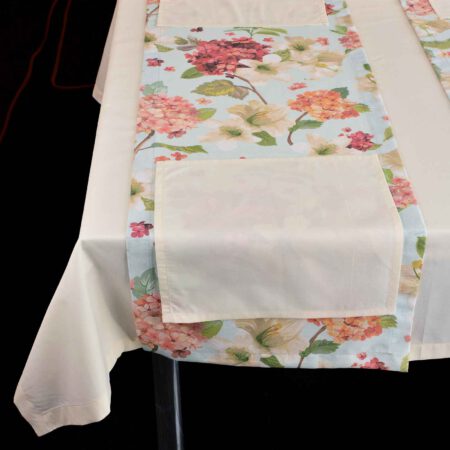 Покривка за маса от памук в екрю/ванилия, четири индивидуални платнени салфетки и два тишлайфера (рънъра), играещи ролята на подложки за сервиране, в десен на цветя.