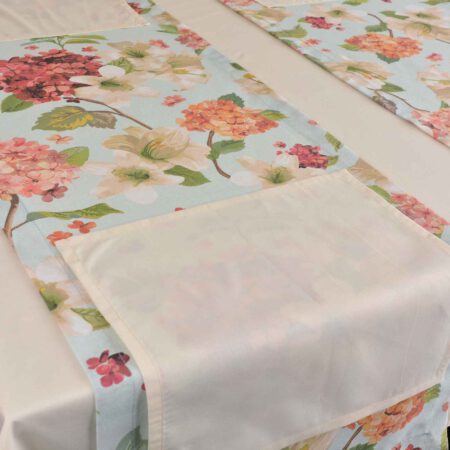 Много нежен семеен комплект от покривки за маса, носещ лятно настроение. Комплектът се състои от покривка и четири платнени салфетки в светли тонове (по избор цвят екрю или ванилия). Те са изработени от качествен 100% памучен плат. Към тях са добавени два тишлайфера (рънъра), които играят ролята и на подложки за сервиране. Тишлайферите са в пастелни тонове и разцветка на летни цветя  (лилиуми и хортензии). Изработени са от материал съдържащ 65% памук и 35% полиестер – лесен за поддръжка.