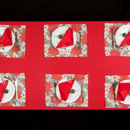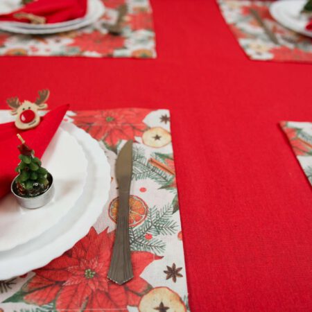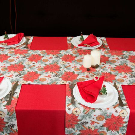 Голям комплект покривки за маса в червено и коледна разцветка. Състои се от червена покривка за маса и 6 бр. индивидуални платнени салфетки в същия цвят. Към тях са добавени тишлайфер за маса и шест подложки за хранене в десен на коледни звезди.