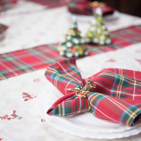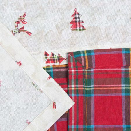 Към тях са съчетани 2 тишлайфера (рънъра) и 2 подложки за хранене в светлобежова гама и малки карирани коледни мотиви. Подложките и тишлайфера са от плат със състав 60% памук / 40% полиестер.