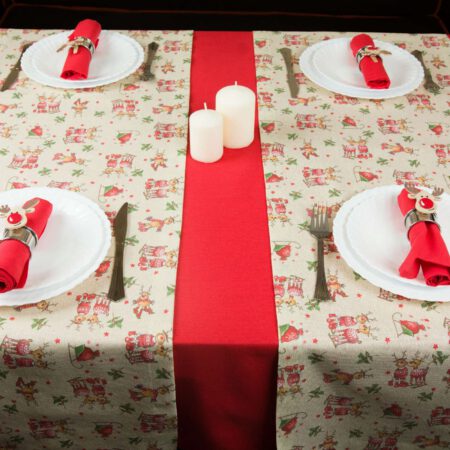 Коледна маса с червена покривка и тишлайфер с еленчета