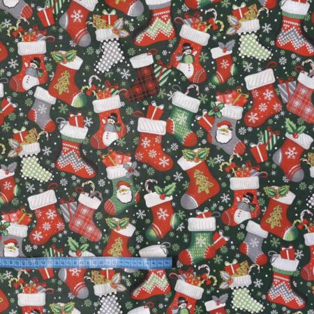 Покривката е от материя 100% памук и е в шарка на коледни чорапчета на тъмно зелен фон. От същия плат са добавени 6 бр. платнени салфетки.