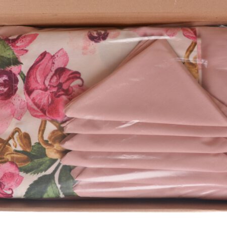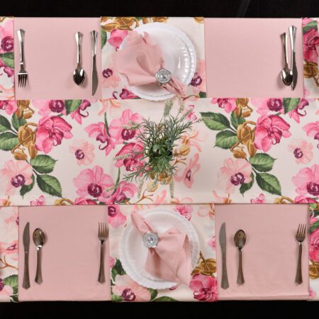 Голям комплект покривки за маса в нежни розови тонове. Състои се от покривка за маса в цвят розова пудра и 6 бр. индивидуални платнени салфетки в същия цвят. Към тях са добавени тишлайфер за маса и шест подложки за сервиране в десен на розови орхидеи.