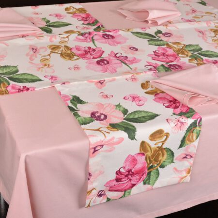 Комплект от покривка за маса и шест индивидуални платнени салфетки в розово + тишлайфер (рънър) и 6 подложки за сервиране в десен на орхидеи.