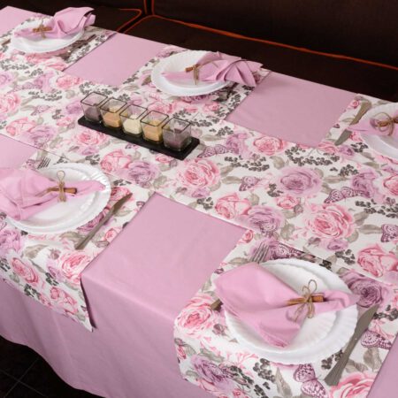 Покривката и салфетките са изработени от висококачествен плат – 100% памук, в цвят пепел от рози. Тишлайферът и подложките за сервиране са в десен на розови и виолетови рози и са от лесен за поддръжка хидрофобиран плат от 70% памук и 30% полиестер. Изделията могат да се перат при висока температура, а гладенето на платове от смес памук и полиестер е изключително лесно и със средно силна ютия.