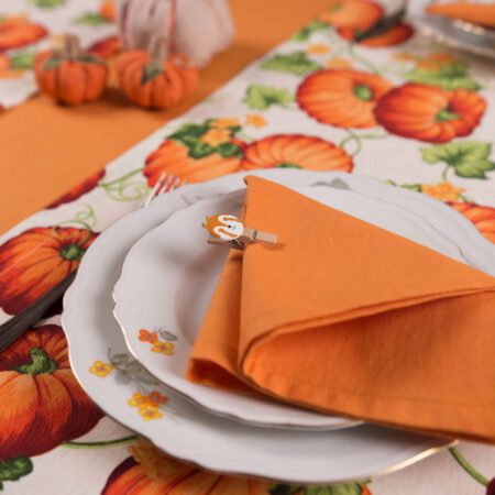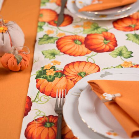Комплект от покривки за сервиране на маса, за четири човека. Съдържа покривка и четири платнени салфетки в оранжев цвят. Към тях са съчетани два тишлайфера (рънъра), които играят ролята на подложки за хранене. Те са в десен на тикви. Покривката и салфетките са изработени от фина 100% памучна тъкан с високо качество. Тищлайферите са със състав 50% памук и 50% полиестер и са от материя лесна за поддръжка.
