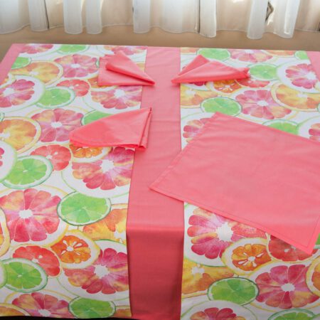 Комплект от коралово розова покривка за маса, съчетана с платнени салфетки в същия цвят и два тишлайфера (рънъра) в десен на розови и зелени цитруси. Покривката и салфетките са изработени от 100% памук. Рънърите внасят свежест и елегантност в комплекта, като играят ролята и на подложки за хранене. Те са от тъкан, която е изключително лесна за поддръжка. Съставът е 60% памук и 40% полиестер. Комплектът ще внесе лятно настроение и свежест на вашата трапеза.