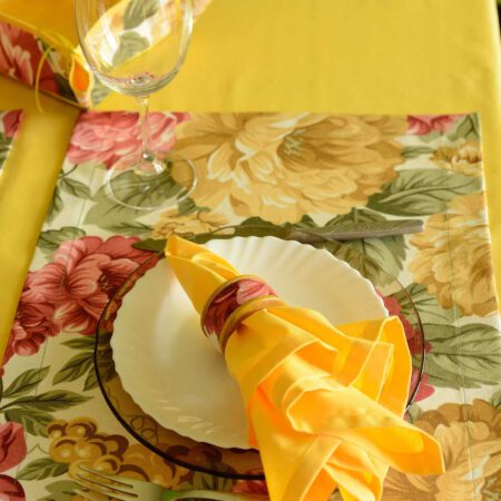 Комплект за маса в топло жълто и флорални мотиви за четири човека. Жълти покривка и персонални салфетки изработени от 100% памук. Подложките за сервиране са в десен на пищни цветя и са от лесна за поддръжка тъкан съставена от 70% памук и 30% полиестер – лесни за гладене, трудно задържащи петна, перящи се при всякаква температура.