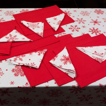 Коледен комплект от покривка за маса и шест индивидуални платнени салфетки в червено + тишлайфер (рънър), 6 подложки за хранене в коледна шарка и 6 пръстена за салфетки с подходящ празничен дизайн.