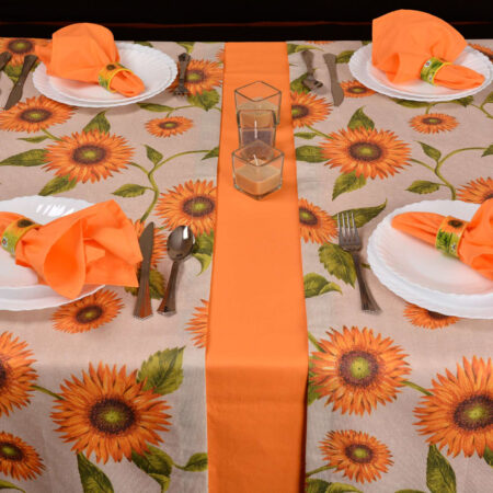 Маса подредена с комплект от оранжева покривка и салфетка и тишлайфер на слънчогледи
