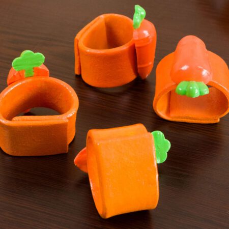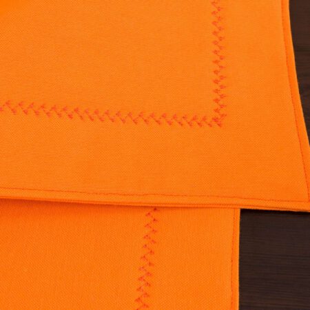 Състои се от покривка и платнени салфетки в разцветка на оранжеви морковчета – 100% памук. Към тях са съчетани двулицеви подложки за хранене в оранжево от материя отблъскваща течности (70% памук / 30% полиестер). Подложките са украсени с декоративни шевове и апликация с морковче. Те са подпълнени с тънък слой вата за по-добра устойчивост и стабилност. За перфектен завършек към комплекта са добавени оранжеви рингове за салфетки с морков.