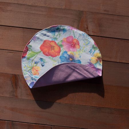 Комплект предназначен за кръгла маса и съставен от шест индивидуални подложки за хранене и централна подложка за сервиране. Трапецовидната форма позволява оптимално и естетично разположение върху трапезата. Подложките са двулицеви, което позволява разнообразие на аранжировките. На практика вие имате два комплекта. От едната страна разцветката е на пъстри теменужки в жизнерадостни цветове, а от другата в светло лилаво. Изработени са от хидрофобна материя, която трудно задържа петна и вода, а същевременно се поддържа лесно и е приятна на допир. Състав 60% памук и 40% полиестер.
