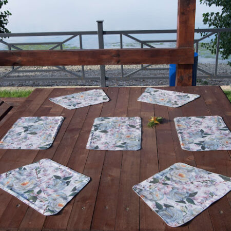 комплект за кръгла маса с двулицеви подложки за хранене със сини рози