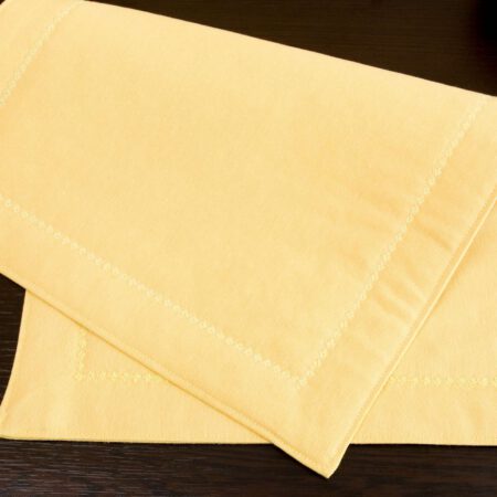 Състои се от двулицеви подложки за хранене в бледо жълто. Украсени са с жълт декоративен шев. Подложките са от хидрофобен плат (отблъскващ течности) със състав 70 % памук / 30 % полиестер и с пълнеж от тънка пресована вата (100 % полиестер) за максимална издръжливост. Лицевата страна е украсена с апликация пиленце, а опаковата е изчистено жълто.
