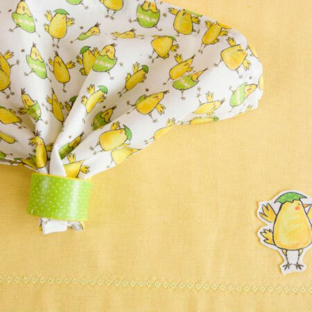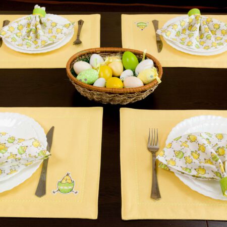 Към комплекта има и четири платнени салфетки за хранене в разцветка на пиленца в жълто и зелено – 100% памук.