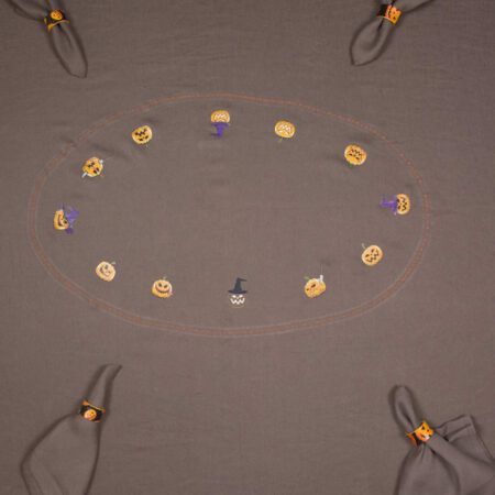 Голяма покривка за маса и 6 платнени салфетки в малсено зелен цвят. Материята е смес от 60% лен и 40% памук и е с изключително мек, кадифеноподобен опип. Лицевата страна е украсена с термоапликации с тикви и бродерия в оранжево. Обратната страна на покривката е изчистена и е само с бродерия, което позволява да се ползва в универсални случаи. Бродерията е елипсовидна, а покривката правоъгълна и подхожда добре както на елипсовидна, така и на правоъгълна маса.
