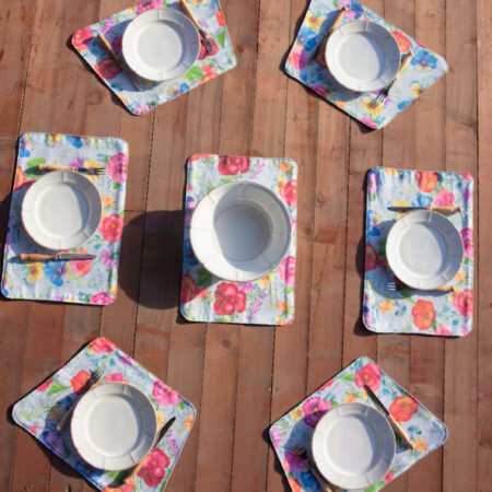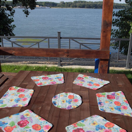 Две платнени индивидуални подложки за хранене в трапецовидна форма, подходящи за кръгла или елипсовидна маса. Двулицеви в разцветка на пъстри теменужки от едната страна и светло лилави от другата. Изработени от хидрофобен материал, незадържащ вода и петна. Състав от 60% памук и 40% полиестер, гарантира лесната поддръжка (пране и гладене на по-ниски температури).