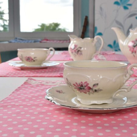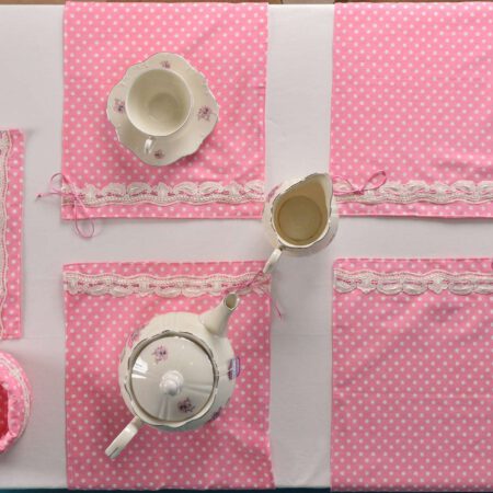 Ръчно изработен дизайнерски комплект от покривка, шест подложки за сервиране и овален панер, в така модерният cottagecore стил. Покривката е в цвят екрю декорирана с широк кант в розово на бели точки. Брюкселска дантела в екрю и сатенен ширит в розово допълват пищният стил на комплекта и идеята за лятна трапеза на вилата. Комплектът е изработен от 100% висококачествена памучна тъкан. Дантелата и ширитът са от 100% полиестер.