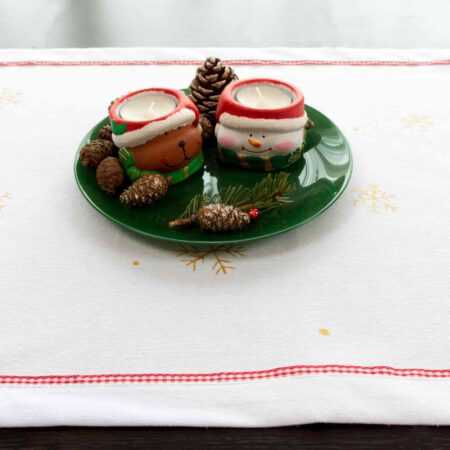 Правоъгълен тишлайфер с ръчно рисувани гномове в двата края и златисти снежинки с различна големина по цялата дължина. Изработен от бял хидрофобиран плат, който не задържа вода и петна със състав 70% памук и 30% полиествер. Използвани са текстилни бои, устойчиви на пране. По края е обточен с борд от червена карирана панделка. Подходящ както за правоъгълни така и за овални маси.
