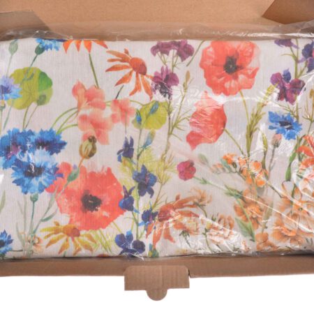 Тишлайфер в бяло с красива шарка на полски цветя, простираща се почти до средата на рънъра. Тесен подгъв за максимална видимост на шарката. Изработен от материал със състав 50% памук / 50% полиестер – лесен за поддръжка.