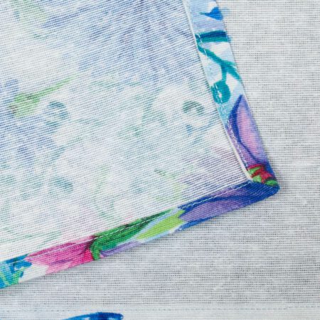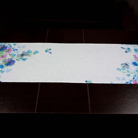 Тишлайфер с цветя и пеперуди, простираща се в голяма част от рънъра. Тесен подгъв за максимална видимост на шарката. Изработен от материал със състав 60% памук / 40% полиестер – лесен за поддръжка.