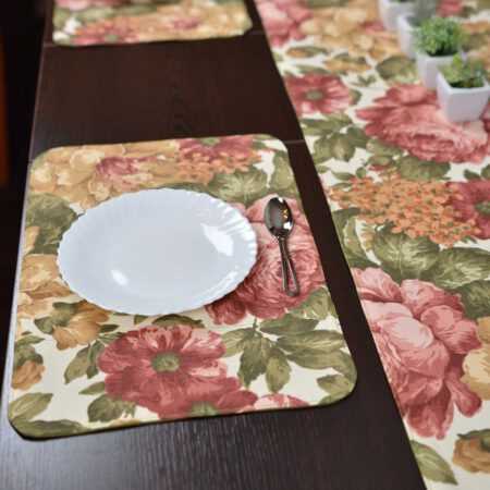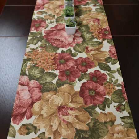 Тишлайфер за маса от хидрофобиран (незадържащ вода и течности) плат с две лица. Платът пада тежко и е със състав 70% памук и 30% полиестер. От едната страна е в тревисто зелен цвят, а от другата с красива шарка на цветя, като по такъв начин имате две различни визии за вашата маса.